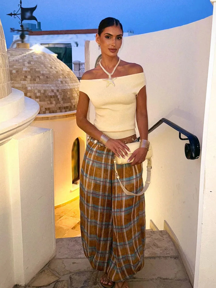 HH Women Autumn New Ramie Bloomers Plaid Printed Loose Pants Female Fashion Versatile Drawstring Streetwear Casual Trousers