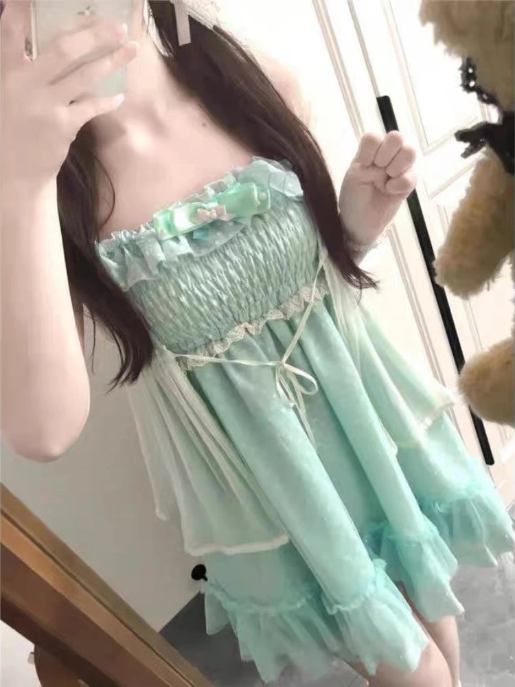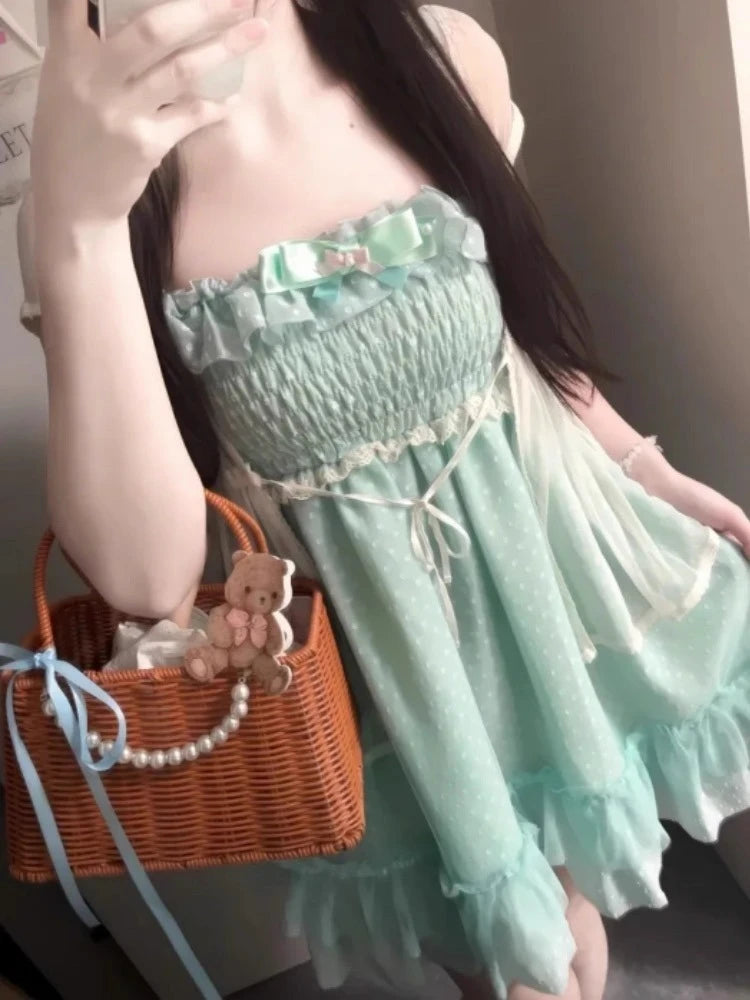 Japanese Fashion Sweet Cute 2 Piece Set Women Mini Lace Tops + Polka Dot Dress New Fit Chic Kawaii Fluffy Retro Suit Summer 2025