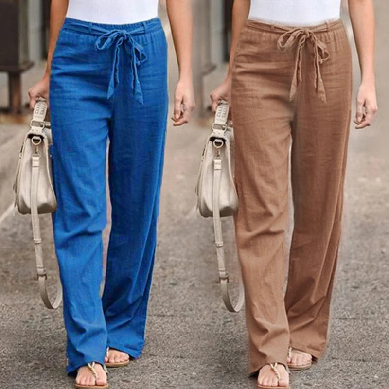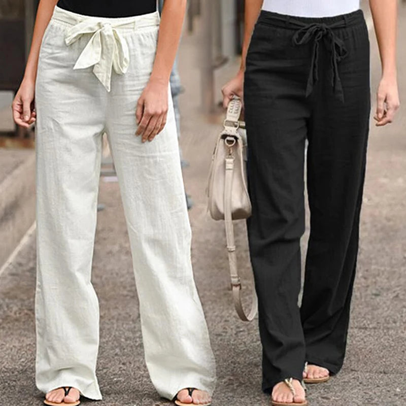 Women Casual Cotton Linen Pants Fashion Solid Color Elastic Waist Loose Straight Pants Female Ankle-length Trousers Summer Pants